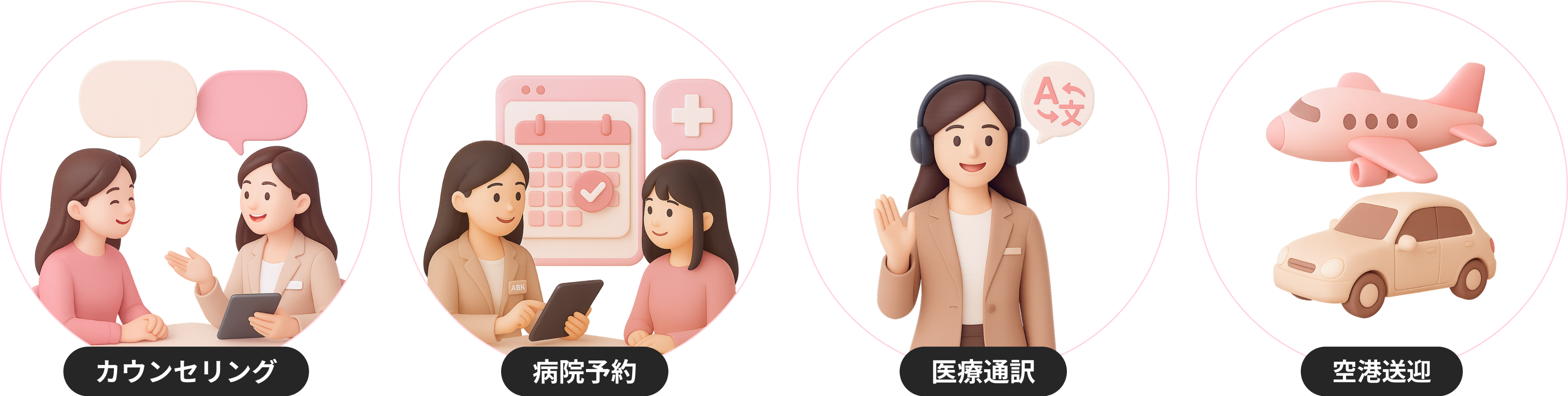 カウンセリング、病院予約、医療通訳、空港送迎など全てが含まれております。