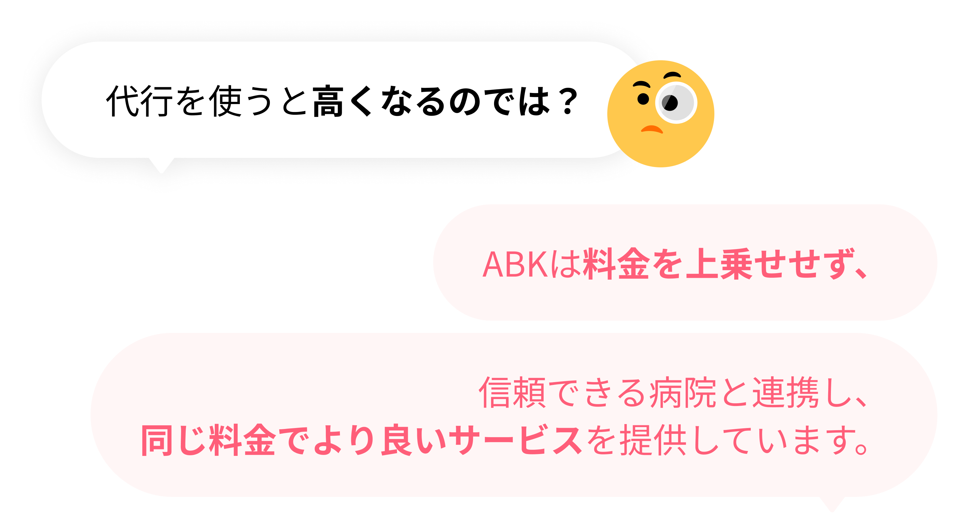 ABKのサービスには 追加料金は一切かかりません。他社のように高額な手数料や不明瞭な追加費用もなく、病院が提示した正確な価格をそのままご案内します。